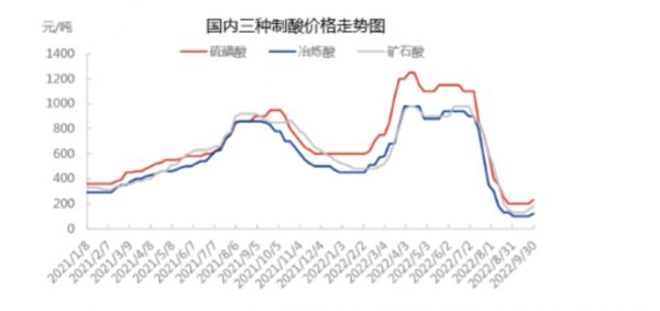 但随着原料价格飞快下行,叠加高温天气、行业淡季以及亏损等因素,需求疲软,三季度开始价格猛跌,最低点触及150元/吨,直到9月开始国内多地市场才陆续进入盘整阶段。整个三季度,98%酸国内均价370元/吨,环比下跌62.94%,同比下跌54.04%。
