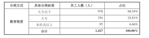 另外,根据招股书显示,公司目前共有员工1427人,其中研发技术人员为159人,占比达到11.14%,刚刚超过高新技术企业10%的要求。但根据员工的受教育度显示,公司93.34%的员工都处于本科以下水平,公司本科以上人数只有95人。