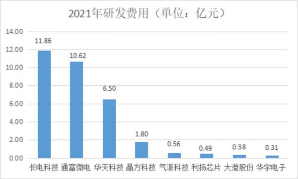 而从研发实力来看,对比则更加强烈。2019年-2021年,公司的研发费用分别为1851万元、2011万元、3103万元,逐年增高。但同期内,长电科技和通富微电的研发费用均超过10亿,即使是业绩规模小于华宇电子的大港股份和利扬芯片,研发费用也均超过华宇电子。