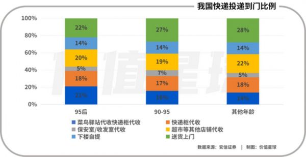 根据2020年BCG《90后快递生活报告》,我国95后消费者使用代收服务(菜鸟驿站代收、快递柜代收、保安室/收发室代收、超市等其他店铺代收)比例高达64%,上门投递比例约36%;其他年龄消费者代收比例均为59%,上门投递比例约41%。综合来看,我国快递上门投递比例只有40%左右。