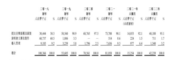 具体来看,风华秋实主要业务分为三部分:授出音乐版权及录制、演唱会主办及制作、艺人管理。其中,授出音乐版权及录制是公司营收支柱,在2019年至2022年上半年间,该业务为公司贡献的营收占比一直在90%以上,2022年上半年达到95.1%。