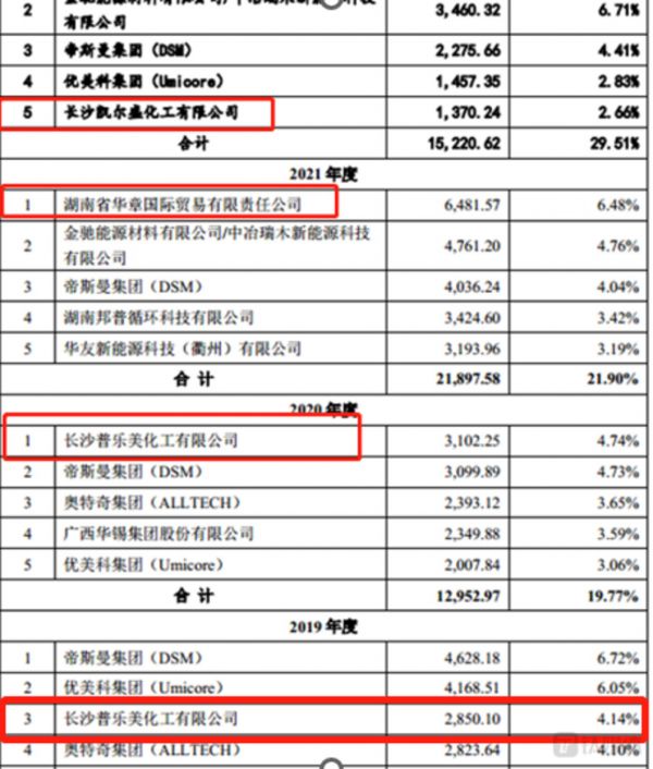 招股说明书显示,2022年1-6月,埃索凯向长沙凯尔盛化工有限公司产生的销售收入为1370.24万元;2021年埃索凯向湖南省华章国际贸易有限责任公司产生的销售收入为6481.57万元;2019年和2020年,埃索凯向长沙普乐美化工有限公司产生的销售收入分别为2850.1万元、3102.25万元,上述客户均位列在埃索凯当期的前五大客户名单中。