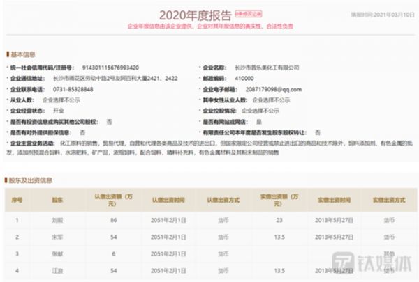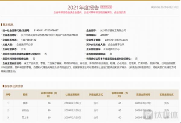 国家企业信用信息公示系统显示,截至2021年末长沙凯尔盛化工有限公司的实缴资本为200万元,湖南省华章国际贸易有限责任公司的实缴资本为2000万元;截至2020年末,长沙普乐美化工有限公司的实缴资本为50万元。