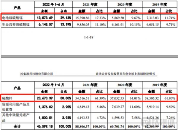 从产品上看,埃索凯主要拥有电池及硫酸锰、生命营养级硫酸锰、硫酸锌、资源利用副产品及处置费、其他中微量元素产品,其中报告期内,硫酸锌产生的销售收入分别为38505.32万元、37032.53万元、54516.51万元、23670.39万元,分别占当期主营业务收入的61.8%、61.01%、61.39%、50.8%,电池级硫酸锰产生的销售收入分别为7313.03万元、5869.5万元、15390.86万元、13573.69万元,分别占当期主营业务收入的11.74%、9.67%、17.33%、29.13%。可以看出,虽然电池级硫酸锰的增长势头较猛,但硫酸锌仍是埃索凯的第一大产品。
