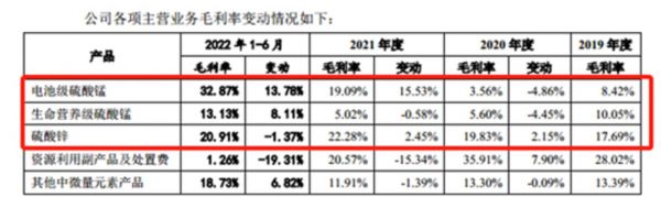 与此同时,对比硫酸锌和硫酸锰两种产品,埃索凯仅2022年上半年电池级硫酸锰的毛利率高于硫酸锌,其余时间段内硫酸锰的毛利率均始终低于硫酸锌。