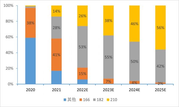 随着硅片尺寸增加,制备出的组件功率更高,同时在组件生产过程中单瓦BOS成本更低,因此,大尺寸组件被认为是组件行业未来的趋势,以182和210mm代表的大尺寸硅片市占率由2020年的不足4.5%上升到2021年的42%,其中210硅片市占率为14%,预计到2025年市占率将会达到56%。