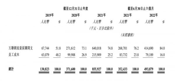 值得的注意的是,九方财富用在互联网流量采购的费用,占总营收的比例也逐年走高,并于2022年上半年首次超过50%的比例。