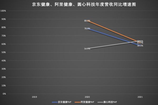 从最近两年年度营收同比增速看,京东健康和阿里健康最近两年的同比增速有所放缓,圆心科技保持了一定程度的增长,但阿里健康的增速领先圆心科技。