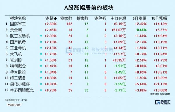 总体看来,24日上涨的板块特色非常集中,基本都是各种硬科技的板块,军工、大飞机、金属材料、工业母机、芯片半导体等。也不止是24日,5日甚至10日的行情这些板块就都一直维持非常强势的表现。