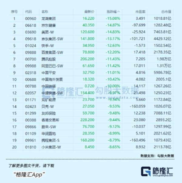 其中,在港股市值还有超千亿规模的巨头中,几大互联网巨头跌幅最为显著,基本都是10CM往上,然后地产集团、医疗平台甚至一些金融巨头的跌幅也都非常可观。