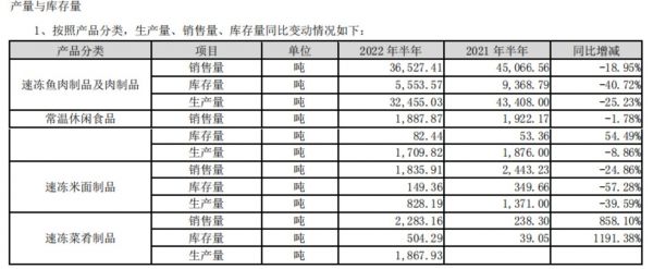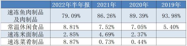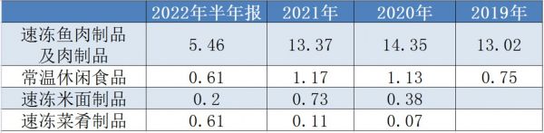 钛媒体APP发现,除了投资损益,业绩巨大波动的背后还源于主营业务乏力,速冻鱼肉制品及肉制品2019年营收13.02亿,2020年增至14.35亿,此后开始下降,2021年13.37亿,2022年上半年仅有5.46亿;占营收比例也逐渐减小,2019年至2022年上半年分别为93.98%、89.39%、86.26%、79.09%。为了需求新的业绩增长点,公司在2020年增加了速冻米面制品和速冻菜肴制品两项新业务,其中速冻菜肴制品业绩突飞猛进,2020年、2021年营收分别为0.07亿、0.11亿,2022年上半年高达0.61亿,远大于前两年营收之和;2020年占营收比重仅0.44%,2022年上半年增至8.87%,速冻菜肴制品营业收入同比增长1216.01%。
