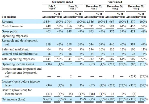 但Mobliey也不是没有隐忧。首先是不容忽视的亏损问题——截至2021年12月25日的财年,Mobileye净亏损为7500万美元,上两个财年净亏损分别为3.28亿美元、1.96亿美元。2022年上半年公司仍亏损6700万美元,而2021年同期为盈利400万美元。