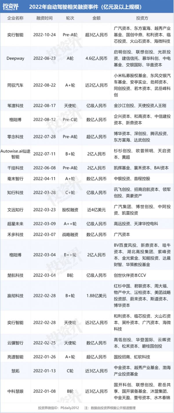 据投资界不完全统计,自2022年至今,自动驾驶行业已发生超过80笔融资事件,其中亿元及以上的大额融资更是有21笔,身后聚集了一众知名VC/PE机构。