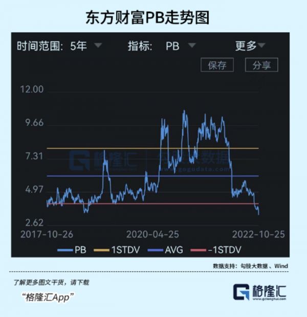 随着大盘的大幅回撤,东财估值泡沫破裂。目前,PB跌至3.28倍,明显低于最近5年估值下行区间。东财从极为高估跌至目前的看似低估,时间仅仅不足1年时间。