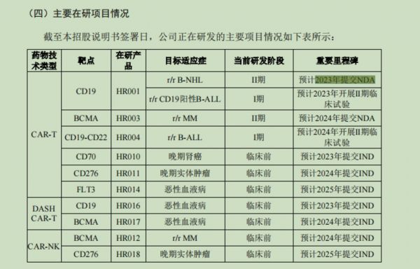 具体而言,HR001治疗复发/难治性B细胞非霍奇金淋巴瘤(r/r B-NHL)适应症被纳入CDE“优先审评审批程序”,已处于II期注册临床试验阶段,预计于2023年提交NDA;HR003治疗复发/难治性多发性骨髓瘤(r/r MM)适应症被纳入CDE“突破性治疗药物程序”,已处于II期注册临床试验阶段;HR001治疗复发/难治性CD19阳性B细胞急性淋巴细胞白血病(r/r CD19 阳性 B-ALL)适应症已处于I期注册临床试验阶段;HR004是 CD19-CD22 双靶点 CAR-T 细胞治疗产品,治疗复发/难治性B细胞急性淋巴细胞白血病(r/r B-ALL)适应症已处于I期注册临床试验阶段。