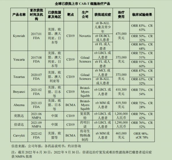 全球已获批上市 CAR-T 细胞治疗产品,截取招股书