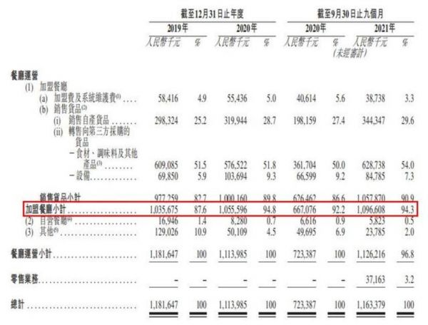 从收入来源看,杨国福公司主要依靠加盟餐厅获得收入,该项目在2021年前9个月占总公司的94.3%,其中超8成营收来自于向加盟商销售“自产货品”和从第三方采购的食材、调味料、设备等。