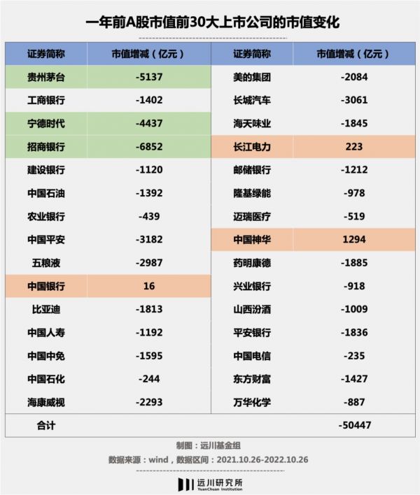 市场情绪流转到今天,跌破2万亿的茅台,只是一个典型。当白马成为了某种原罪,大票们早已集体扑街。回望一年前A股市值前30大的上市公司,一年的时间里已经整体缩水了5万亿市值,仅招行、茅台和宁德三大龙头加起来就蒸发了1万6千多亿。30家上市公司中仅有长江电力、中国神华和中国银行市值有所上升。