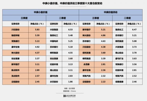 三季报发布后,丘栋荣管理的中庚小盘价值、中庚价值灵动两只没有港股仓位的基金都大幅加仓了川仪股份,分别位列第一、第四大重仓。而中庚小盘价值二季度的第一大重仓股兴发集团已不在前十大之列。
