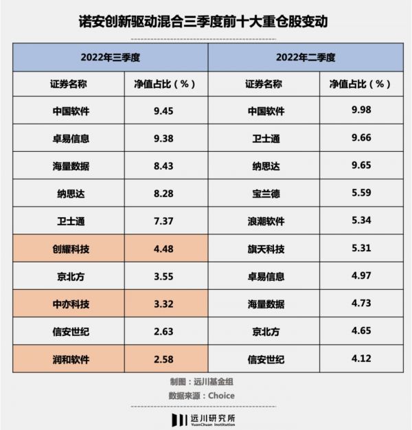 在信创上的布局,蔡嵩松复制了半导体的极致。2022年年初,蔡嵩松便将诺安创新驱动的前十大持仓全部进行了替换,由半导体芯片行业切换到了计算机软件行业。
