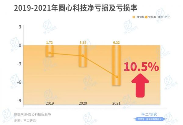 与此同时,圆心科技在2019-2021年,三年累亏超13亿元;其亏损率由2019年的7.3%上升到2021年的10.5%。