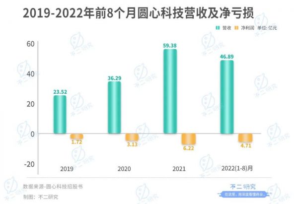 圆心科技招股书显示:2019-2021年及2022年前8个月的营收23.52亿、36.29亿、59.38亿、46.89亿;尽管2019-2021年其营收规模逐年上升,但亏损额度也在持续扩大,难逃“增收不增利”。