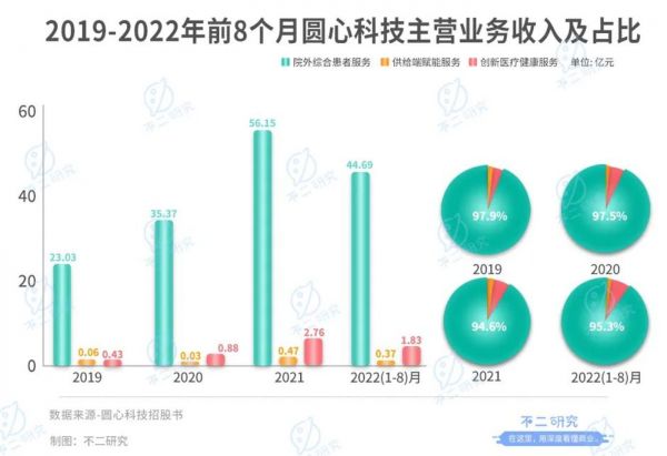 2019-2021年,圆心科技三年累计营收119.19亿元。以2021年为例,其营收59.38亿元,来自院外综合患者服务的收入为56.15亿元,当期营收占比高达94.6%。