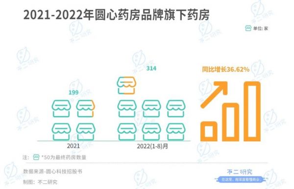 据招股书显示,截至2022年8月31日,圆心药房品牌旗下拥有314家药房,较上年度的199家增长36.62%。
