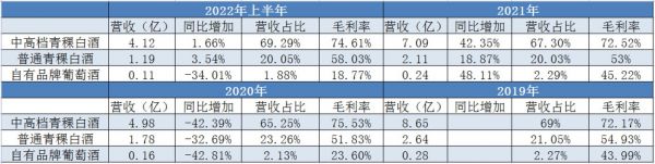 业绩“疲软”和主营业务增长乏力有很大关系,数据显示,2019年至2021年,主营业务毛利率最高的中高档青稞白酒的营收分别为8.65亿、4.98亿、7.9亿,2022年上半年也仅有4.12亿,占营收比例为69.29%,与2019年69%占营收比例持平,对营收的贡献程度可以说是“原地踏步”,毛利率第二高的普通青稞白酒也是如此;占营收比例最低的自有品牌葡萄酒业务表现也不佳,毛利率浮动较大,从2019年的43.99%降至2022年上半年的18.77%,2022年上半年该业务营收仅0.11亿,同比下滑34.01%。