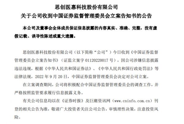 10月28日晚间,思创医惠发布公告称,公司当日收到《中国证券监督管理委员会立案告知书》,因公司涉嫌信息披露违法违规,9月20日,证监会决定对公司立案。
