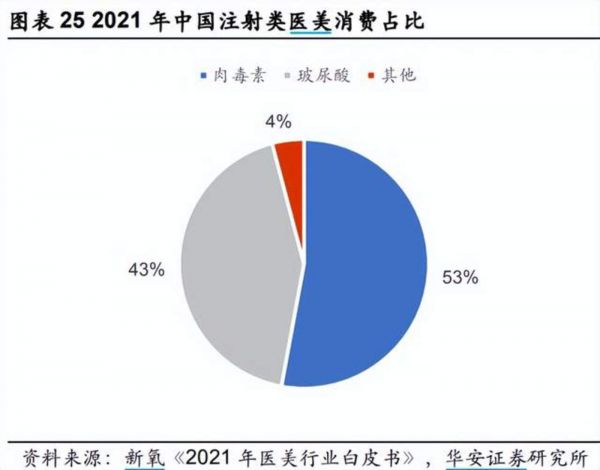 首先看产品属性,肉毒素产品和玻尿酸产品一样,都是注射用医美产品,而且都是医美机构常用于获客的产品,需求较大。根据新氧《2021年医美行业白皮书》显示,2021年中国注射类医美消费基本被肉毒素和玻尿酸占据,分别占比为53%和43%。