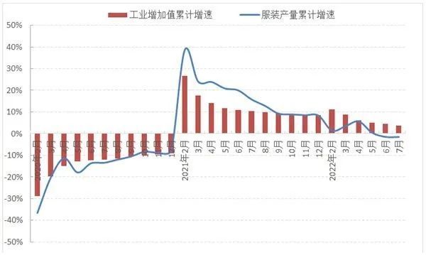 根据国家统计局数据,2022年1-7月,服装行业规模以上企业工业增加值同比增长3.6%,增速比上年同期放缓6.8个百分点,比1-6月放缓0.8个百分点。