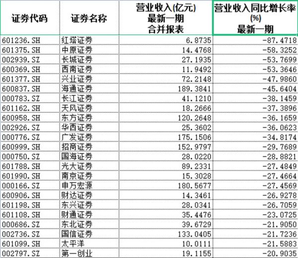 另经统计,还有超八成券商机构今年前三季度的营业收入同比下降,营业收入降幅超两成的券商数量达到23家。红塔证券、中原证券、长城证券、西南证券4家券商今年前三季度的营业收入更是“腰斩”,降幅最大的是红塔证券,达87.47%。