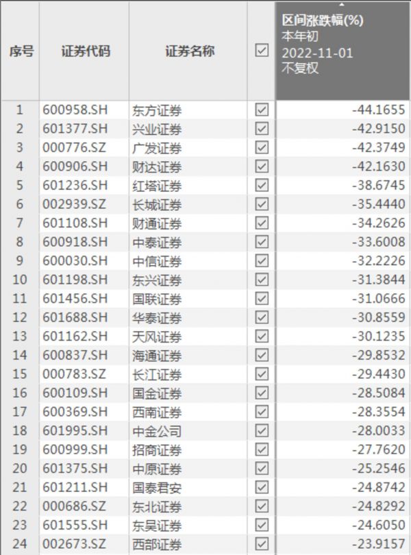 正如王剑辉所言,年初至今,券商整体板块的跌幅为23.33%。据东方财富Choice统计,41只券商股也“无一幸免”,年内股价均出现不同程度下跌,西部证券、东吴证券、招商证券、中金公司等24股年内股价的累计跌幅均高于券商整体板块跌幅,其中东方证券“领跌”。