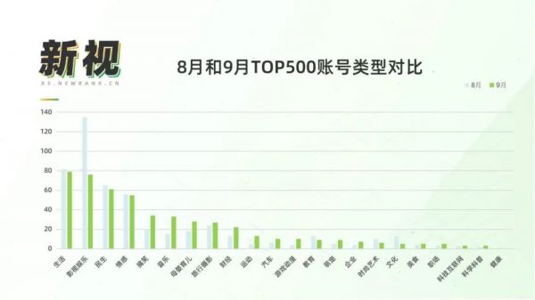 基于此,在视频号今年的TOP500账号类型之中,生活、影视娱乐、音乐账户数目保持着较快速度的增长。