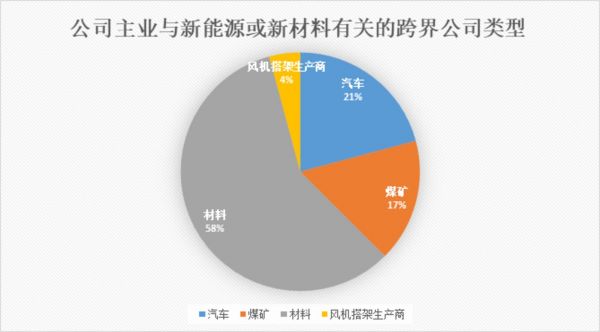 在这次,主业与新能源和新材料相关的公司中就包括风机搭架生产商、汽车类、煤炭类、材料类的公司,分别占据了4%、21%、17%和58%。