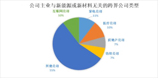 另外,主业与新能源或新材料无关的跨界公司中,就有互联网公司、家电公司、医疗公司、房地产公司、纺织公司和其他公司等,分别占据了10%、11%、10%、7%、7%、55%。