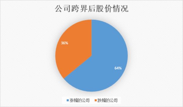 在统计的50家公司中,发布跨界新能源或新材料领域后,股价有所涨幅的公司占据64%,而有所下跌的公司则占据36%,通过数据大体判断,目前与新能源或新材料这一话题相关的公司就会受到二级市场的欢迎和关注。