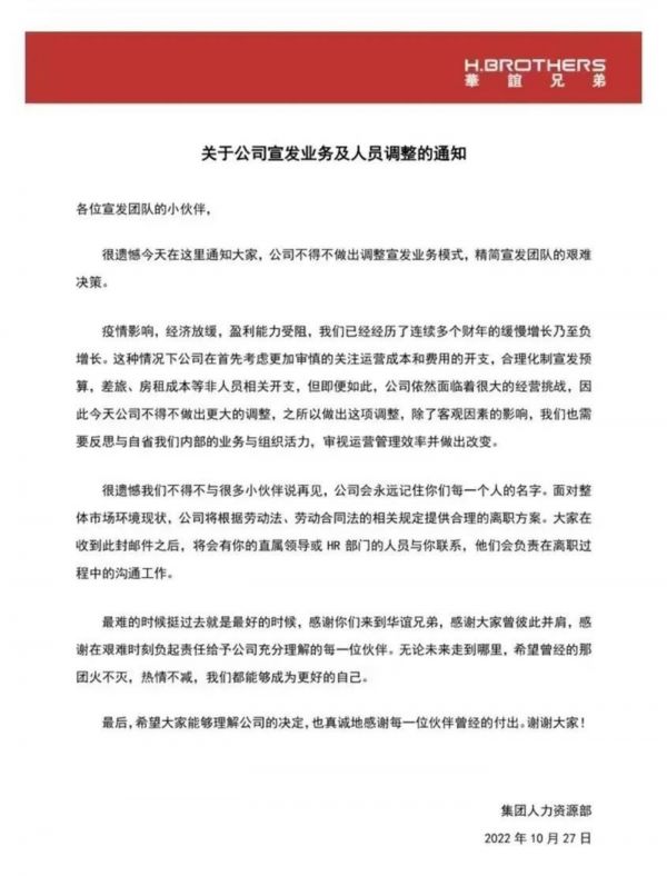 10月27日,华谊兄弟发布《关于公司宣发业务及人员调整的通知》,宣布公司将调整宣发业务模式,精简宣发团队。华谊的收缩裁员,仿佛为影视公司并不理想的Q3财报给出注释。当日网络更有传言称“著名导演冯小刚移民美国”,已被冯小刚否认。