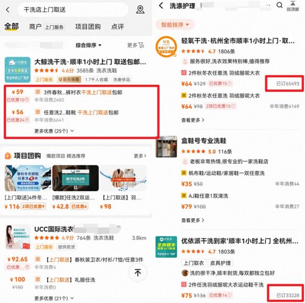 总体来看,这个价格和线下干洗店相比,基本持平。在美团上搜索“干洗店上门取送”,商家基本都会打出顺丰包邮、上门取送的卖点。一家名为“大鲸洗干洗”的店铺,价格叠加优惠后,春秋装59元洗3件,冬装56元洗2件,半年销量分别达到2480件、6641件。