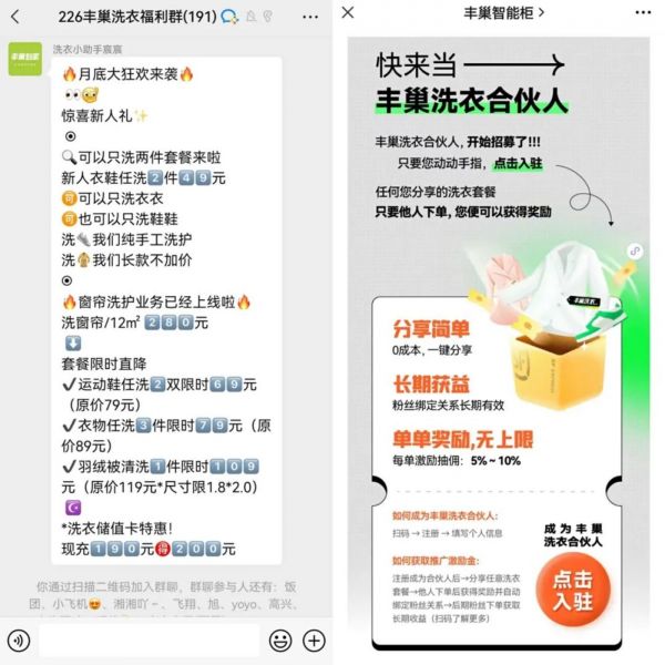 即将进入11月,换季碰上双11,丰巢最近也在大力推广自己的洗衣业务。除了新人会有补贴价以外,丰巢也在通过“9块9秒杀”引流,鼓励用户加群,培育私域流量;与此同时,丰巢洗衣储值卡冲190元得200元的活动,也能看出其业务要作为长期性项目运营的规划。此前,丰巢还曾推出过“洗衣合伙人”的招募计划,成为合伙人后,合伙人分享的洗衣套餐,只要有粉丝下单,每单就会给到合伙人5%—10%的抽佣激励,且粉丝绑定关系长期有效。