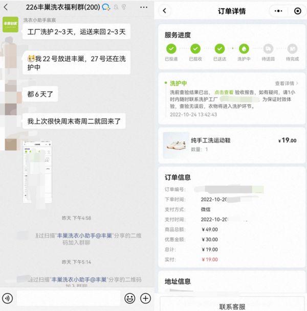 不过,对比线下门店,开在家门口的同城配送,在时效上依然占有优势。在丰巢洗衣的微信运营群,有顾客表示,“22号(将衣物)放进丰巢,过去了6天,27号还在洗护中。”