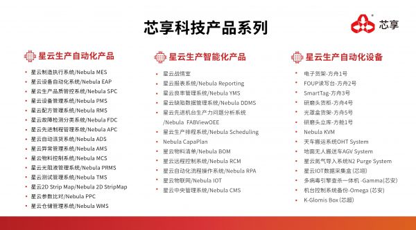 在产品方案上,芯享科技已形成满足半导体工厂生产制造自动化所需的软件矩阵,拥有完善的晶圆制造和封装测试工厂生产所需的智能自动化软硬件三大产品线——以MES、EAP、SPC等为代表的自动化系统帮助工厂实现高度自动化生产、质量管控以及生产异常防范;RCM、Reporting、Scheduling等智能化系统帮助工厂实现生产效能提升以及良率和成本优化;同时N2 Purge、AGV、SmartTag、eRack等自动化硬件设备帮助工厂解决生产中通讯、物料物流管理中的痛点,进一步优化生产的效率、良率。