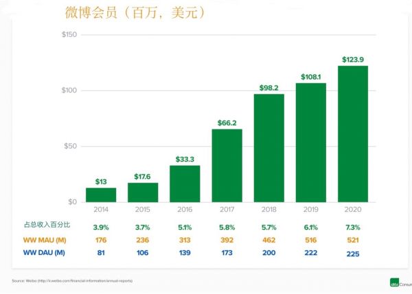 对于微博、爱奇艺等,会员的主要价值不是作为一个大的收入来源,而是作为一种客户参与的方式。 2020 年,微博的VIP 会员年收入为 1.23 亿美元,大约仅占整体收入的 7% 左右。从这项数据看来,这并不是一个巨大的收入占比(见下图),尤其是在该计划于 2012 年推出 8 年后,该平台拥有 5.21 亿月活跃用户。然而,84.8%的付费会员每月使用微博超过15天,VIP会员在微博上发帖的次数是非VIP会员的四倍,证明了此项目的粘性和吸引力。