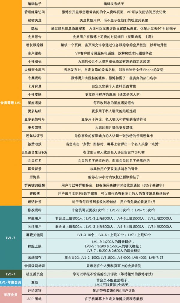 每月只需 3.50 美元,微博 VIP 会员就可以编辑他们已经发表过的帖子、在他们的评论区加贴纸、使用 VIP 丰富的表情符号等等(见下表)。但继续使用微博的时长增加和经验值增加,会解锁更多功能,例如置顶多个帖子。这种付费与用时间赚取的分离也有助于微博避免出现富裕会员与收入较低的会员竞争的情况。