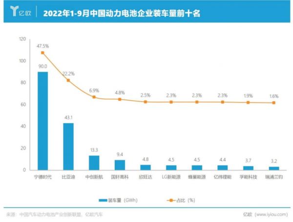 据中国汽车动力电池产业创新联盟统计,2022年1至9月,中国动力电池产量累计达到372.1Gwh,同比增长176.2%;装车量为193Gwh,约占51.9%;出口量达90.6Gwh,接近24.3%,而中国动力电池产量约占世界总产量的60%。