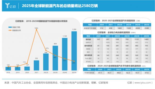 亿欧智库预测,到2025年全球新能源汽车的总销量将达2580万辆,同时2025年全球新能源汽车动力电池的装机量将达1485GWh,平均单车装机量57.6KWh。