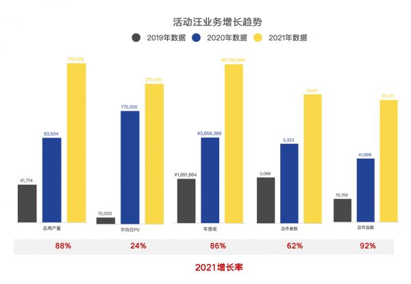 2021年,活动汪平台每天pv达30w+,每日在线人数达2w+,辐射全国用户约30w+,平台中活动作品数达10w+个,活动高清图数达110w+,搭建相关社群125个,共计辐射约5w相关从业者。