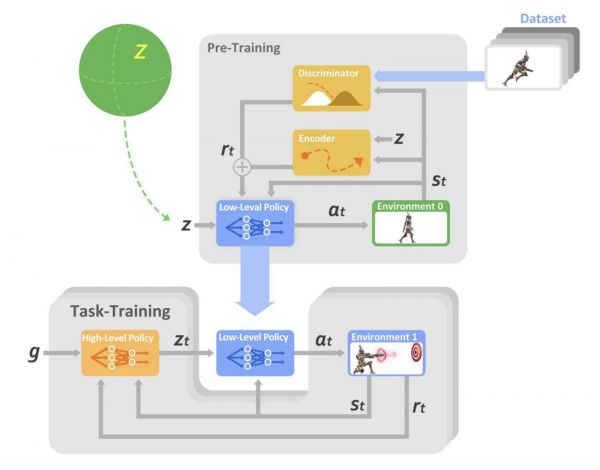 low-level policy可以为各种通用动作建模,根据Environment0定义的玩家习惯状态集可以实现挥剑、走路、冲刺、弯腰、射击等通用动作的训练。在目标训练期间: High-level policy w(z|s,g)被定义为以动作空间数据集s里面用为动作组合z作为变量实现目标g的一个映射,其中z=array(a)。通过High-level policy,已经学会Low-level policy的AI Being可以被指示执行各种特定任务,这些特定任务由Low-level policy里面的一组动作拼接连成。