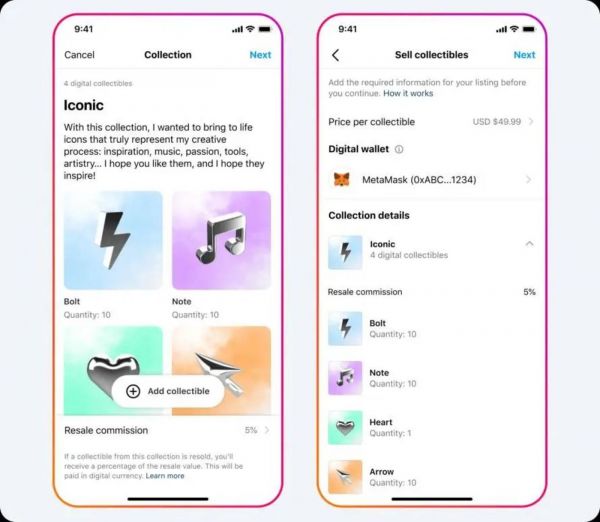 粉丝们则可以直接在 Instagram 中购买 NFT,走传统的应用内购买路线,即用信用卡或借记卡购买,再将 NFT 存入数字钱包,所以仍需缴纳应用商店费用,包括备受争议的 30%「苹果税」。